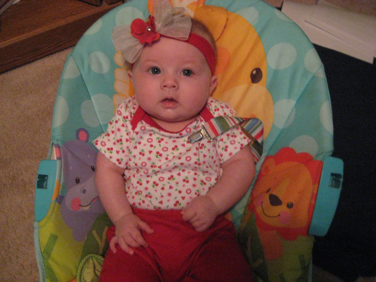 Haylee has been growing up so fast. I remember everybody telling me that and me thinking yeah yeah. But now that I have a child it is so true I really can't believe how fast time goes. Haylee is almost 6 months old. She now eats baby food. She is more interactive with her world. She knows who I am and who Mike is. She has so much personality and loves other children. She is also starting to be able to entertain herself better and doing better when she is left alone in a room. She sleeps through the night for the most part and is a very happy baby.
